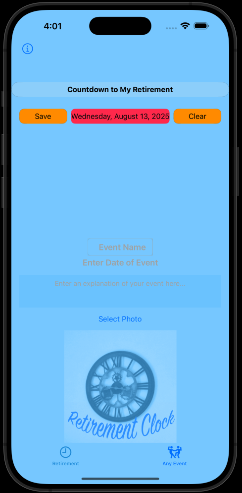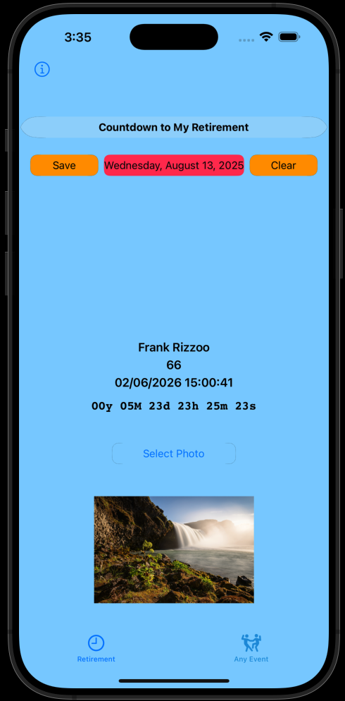 Just add your name, age and date you plan on retiring and click save. You can also personalize it with a picture! Just tap Select Photo and tap Save.