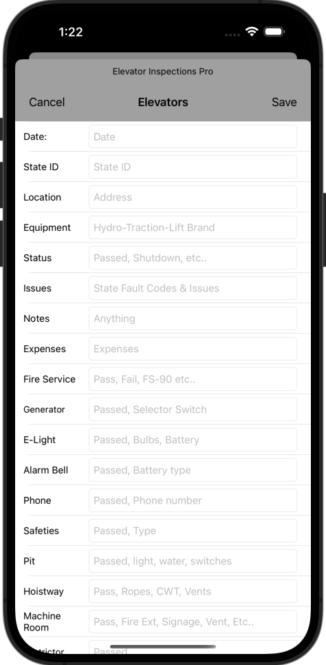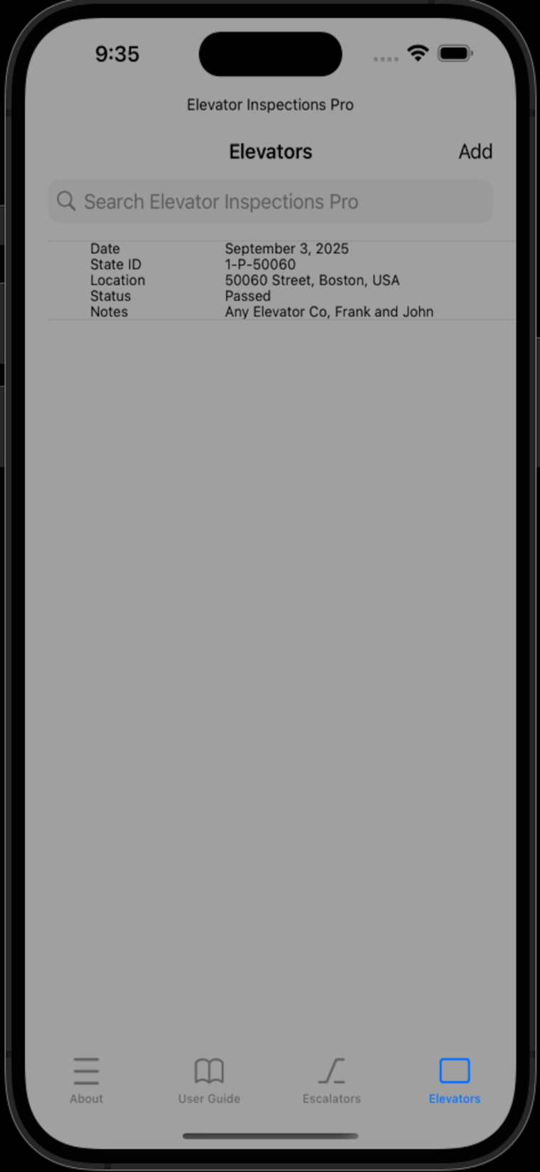 When you are ready to add a new inspection tap the Elevators or Escalators tab and tap the Add button.