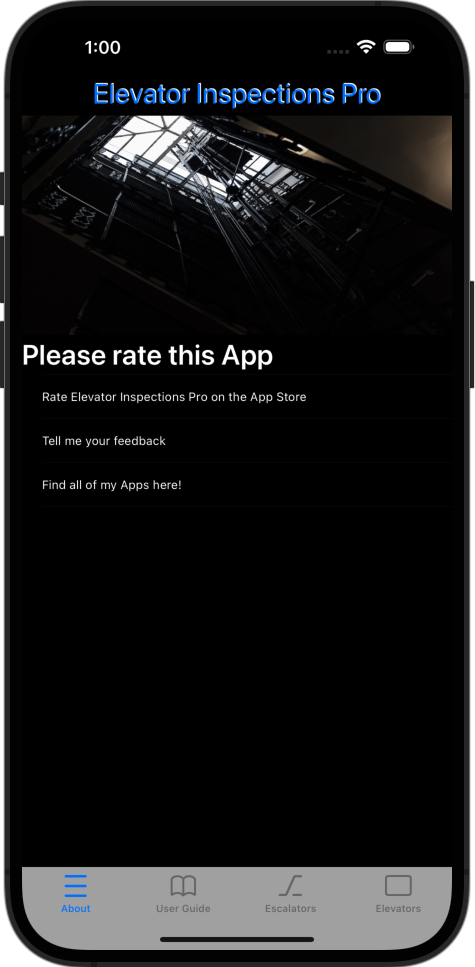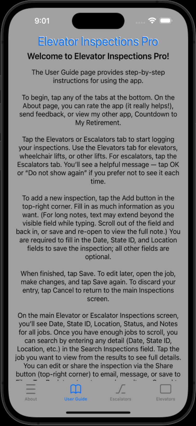 Tap the User Guide tab to read simple, easy-to-follow instructions on how to use the Elevator Inspections Pro app.