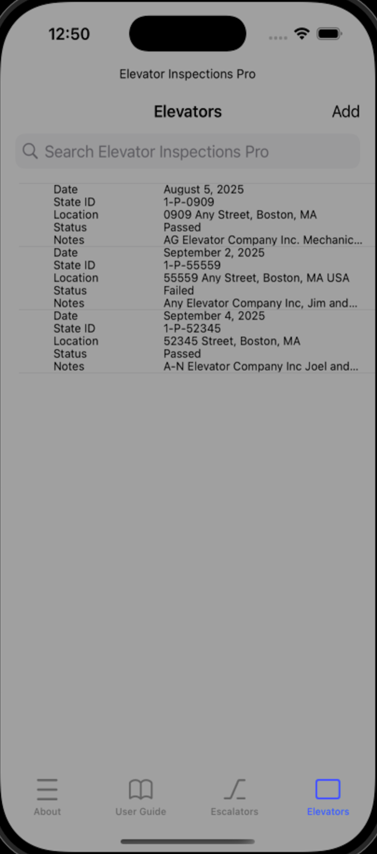When you are ready to add a new inspection tap the Elevators or Escalators tab and tap the Add button.