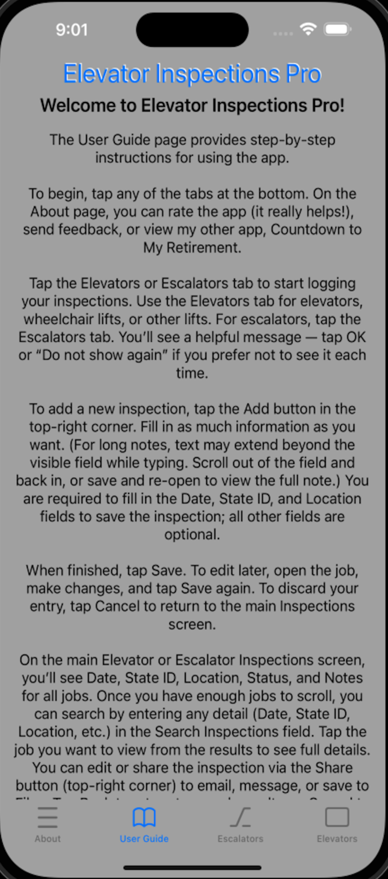 Tap the User Guide tab to read simple, easy-to-follow instructions on how to use the Elevator Inspections Pro app.