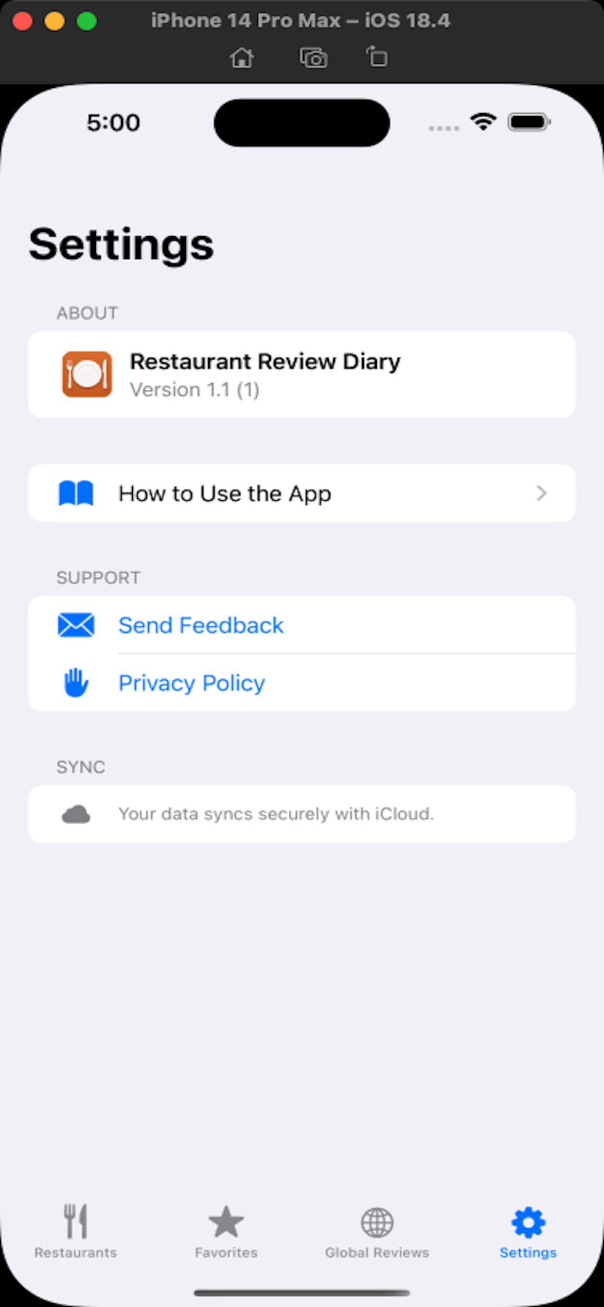 In the Settings tab, you can view the How to use the App guide, send feedback, or read the Privacy Policy — and your data always syncs securely through iCloud.