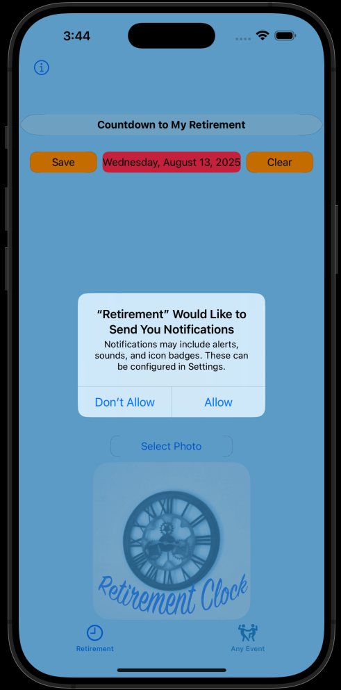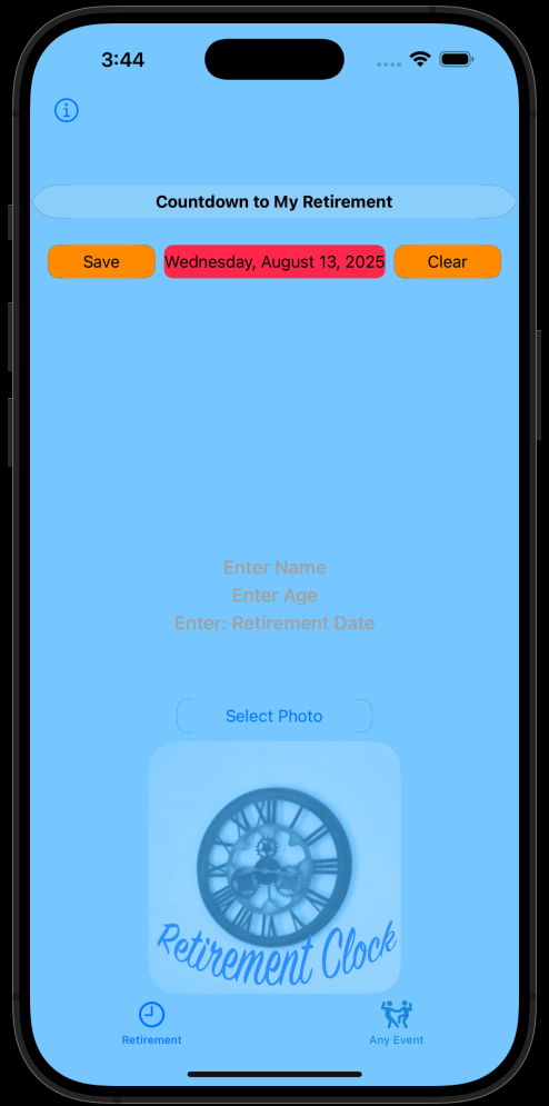 Just add your name, age and date you plan on retiring and click save. You can also personalize it with a picture! Just tap Select Photo and tap Save.